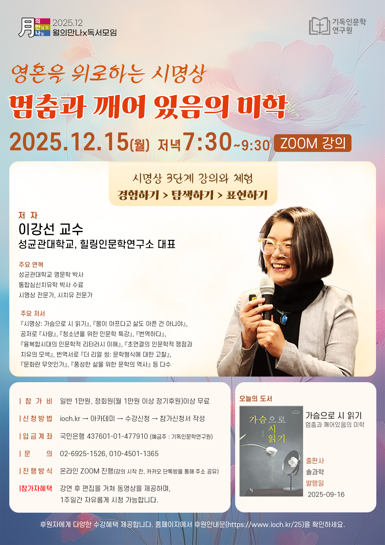 1. [12월 월의만나 - 독서모임: 참가 신청 중] 이강선 교수 - 영혼을 위로하는 시명상: 멈춤과 깨어있음의 미학